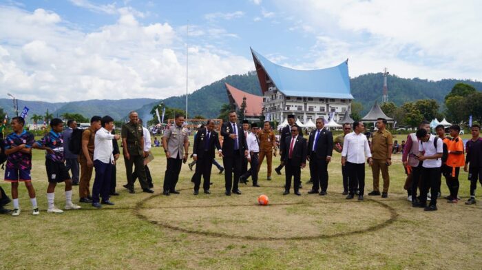 Toba-Intipnews.com:Bupati Toba Effendi Napitupulu SE didampingi Wakil Bupati Toba Audi Murphy Sitorus SH dan jajaran Forkopimda membuka pertandingan futsal antar pelajar pada perayaan HUT ke-27 Kabupaten Toba di pendopo rumah dinas Bupati Toba pada Senin (9/3/2027) siang.