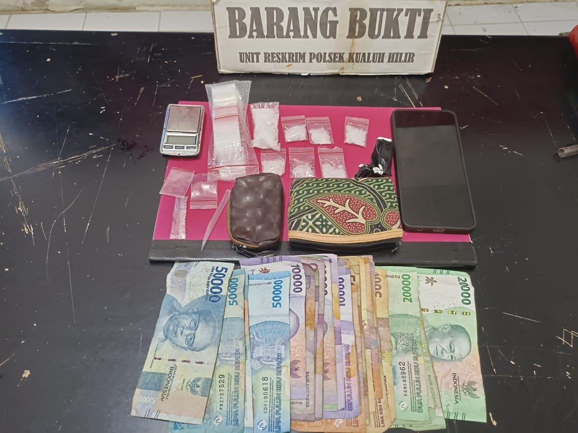“Dari tangan tersangka, berhasil disiita barang bukti berupa tujuh bungkus plastik klip transparan ukuran besar yang diduga berisi narkotika jenis sabu seberat 12,08 gram brutto, satu bungkus plastik klip sedang berisi plastik klip kecil, satu lembar kertas berlapis lakban, dua dompet, satu timbangan elektrik, satu pipet berbentuk sekop, satu unit handphone Vivo, serta uang tunai diduga hasil penjualan narkoba sebesar Rp 525.000” terangnya. (foto).
