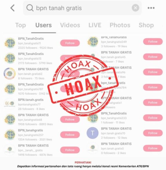 Jakarta-Intipnews.com:Belakangan beredar informasi di platform TikTok mengenai akun yang menyebarluaskan hoaks “BPN Tanah Gratis”. Akun tersebut mengunggah video yang mengklaim adanya layanan pembuatan sertipikat tanah dan layanan balik nama tanah secara gratis hanya dengan mengklik tautan“daftarsekarang-v11.infokuresmidotcom” pada bio akun tersebut. Kementerian Agraria dan Tata Ruang/Badan Pertanahan Nasional (ATR/BPN) menegaskan bahwa informasi tersebut tidak benar. Tak ada program resmi yang menawarkan sertipikasi maupun balik nama tanah secara gratis, seperti yang disampaikan akun tidak resmi tersebut.