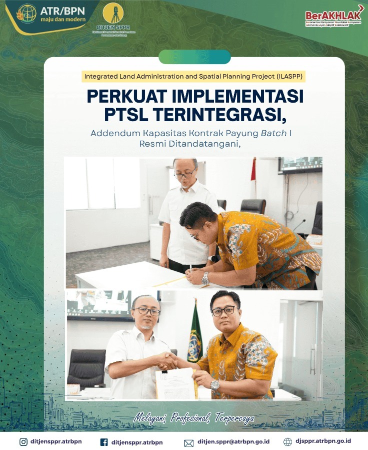 Jakarta-Intipnews.com:Kementerian Agraria dan Tata Ruang/Badan Pertanahan Nasional (ATR/BPN) melaksanakan Pengarahan dan Penandatanganan Adendum Penambahan Kapasitas Kontrak Payung Pendaftaran Tanah Sistematis Lengkap (PTSL) Terintegrasi. Agenda ini dilaksanakan dalam rangka pelaksanaan kegiatan Pengukuran, Pemetaan, dan Informasi Bidang Tanah PTSL Terintegrasi dengan sumber dana Pinjaman dan/atau Hibah Luar Negeri (PHLN) pada Integrated Land Administration and Spatial Planning Project (ILASPP).