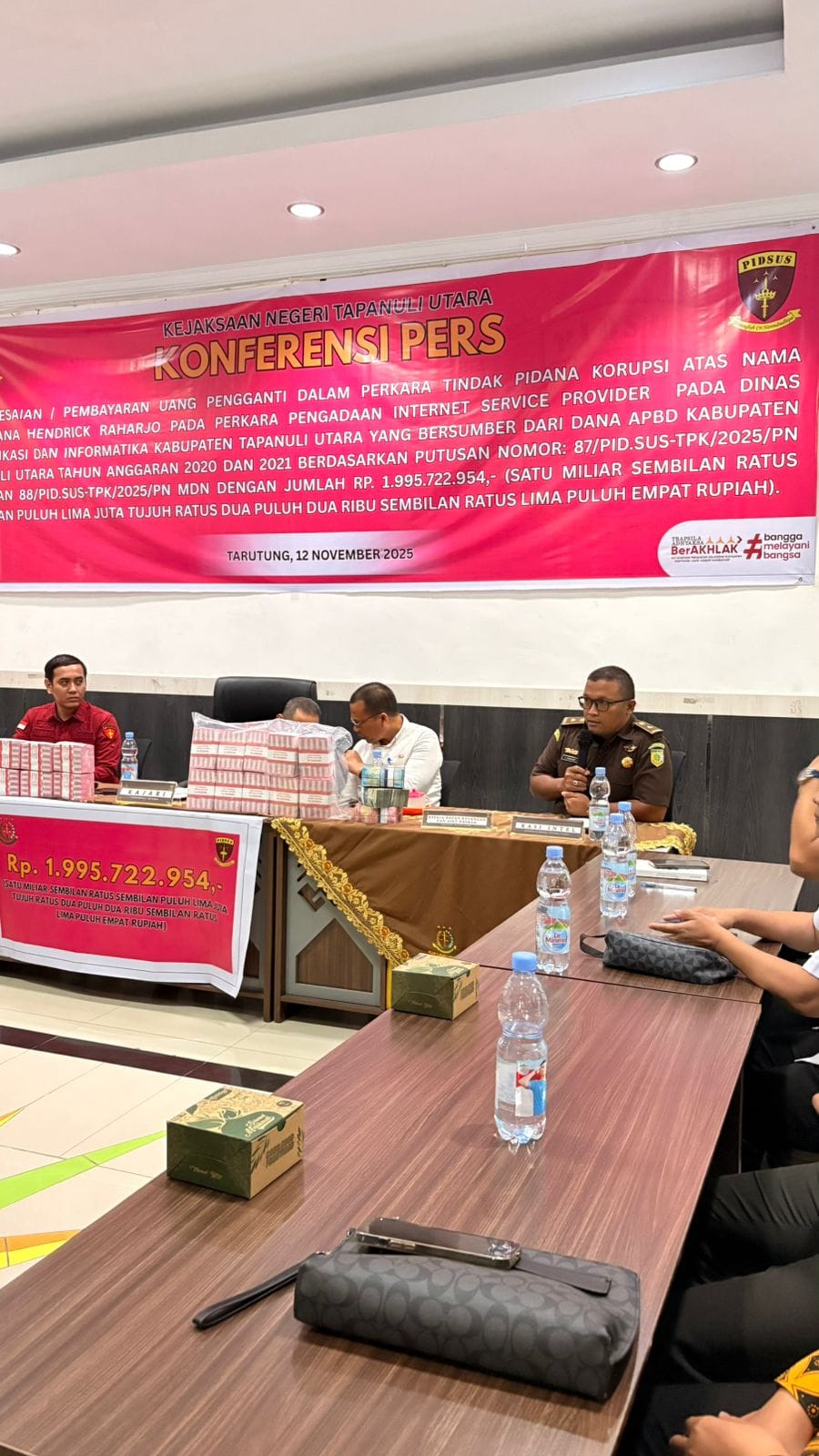 Taput-Intipnews.com:Pihak kejaksaan Negeri Tapanuli Utara, menerima uang pengganti tindak pidana korupsi, dalam perkara pengadaan Internet Servce Provider, Pada Dinas Kominfo Kabupaten Tapanuli Utara, tahun anggaran 2020 dan 2021, senilai Rp. 1.995.722.954,- (satu miliar sembilan ratus sembilan puluh lima juta tujuh ratus dua puluh dua ribu sembilan ratus lima puluh empat rupiah), di Aula Kantor Kejaksaan Negeri Tapanuli Utara, Rabu (12/11).