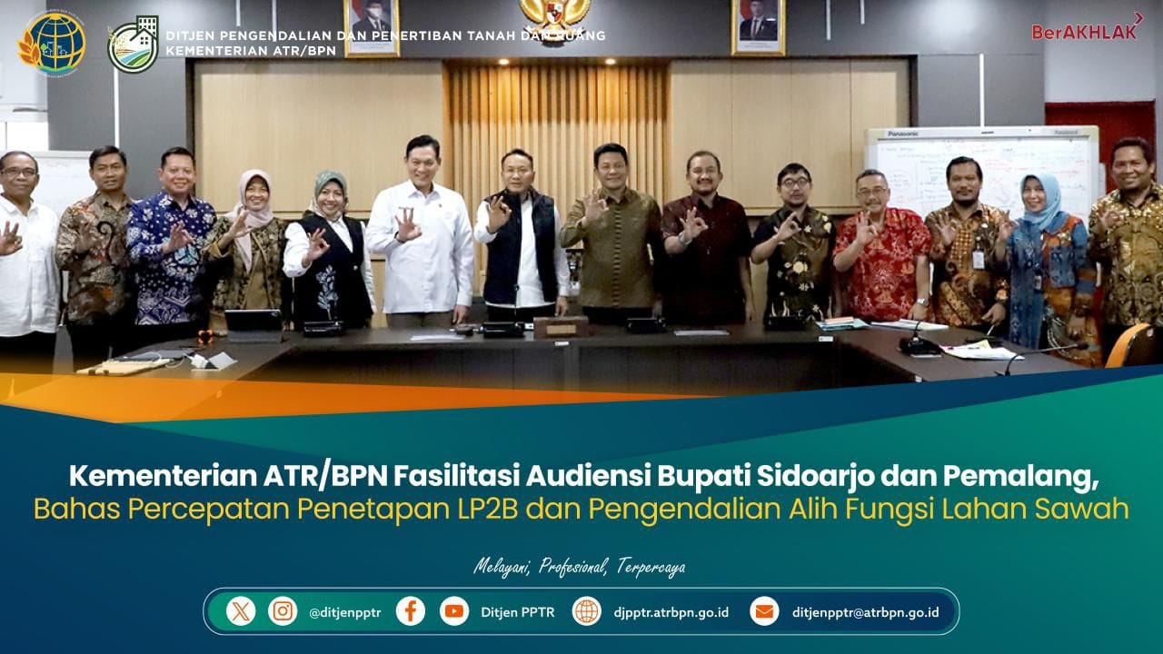 Jakarta-Intipnews.com:Kementerian Agraria dan Tata Ruang/Badan Pertanahan Nasional (ATR/BPN) melalui Direktorat Jenderal Pengendalian dan Penertiban Tanah dan Ruang (PPTR) memfasilitasi audiensi Pemerintah Kabupaten Sidoarjo dan Pemerintah Kabupaten Pemalang pada Jumat, (13/3/2026) guna membahas percepatan penetapan Lahan Pertanian Pangan Berkelanjutan (LP2B) serta pengendalian alih fungsi lahan sawah.