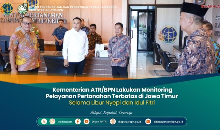 Jawa Timur-Intipnews.com:Kementerian Agraria dan Tata Ruang/Badan Pertanahan Nasional (ATR/BPN) melakukan monitoring dan evaluasi (monev) terhadap penerapan kebijakan pelaksanaan tugas kedinasan secara fleksibel serta pelayanan pertanahan terbatas selama masa libur cuti bersama Hari Suci Nyepi Tahun Baru Saka 1948 dan Hari Raya Idul Fitri 1447 Hijriah.