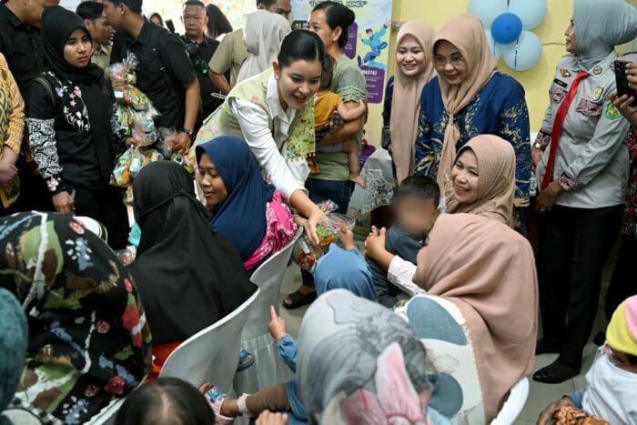 Didampingi Kepala Perwakilan Badan Kependudukan dan Keluarga Berencana Nasional (BKKBN) Sumut Fatmawati, dan Ketua TP PKK Kota Medan Airin Rico Waas, Kahiyang Ayu menyalurkan bantuan makanan bergizi gratis secara simbolis kepada 21 penerima manfaat.