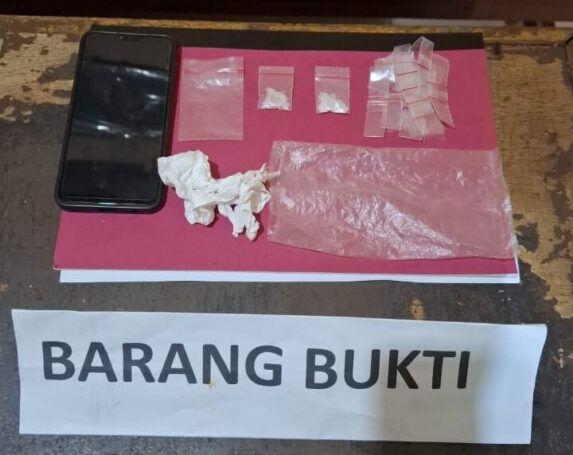 Satu bungkus diduga berisi sabu dengan berat bruto 2,29 gram, satunya lagi berisi 24 plastik klip kecil kosong, satu lembar tisu putih, satu plastik transparan sedang. Kemudian, satu unit handphone Android warna hitam, serta satu buah mancis warna biru. (foto).