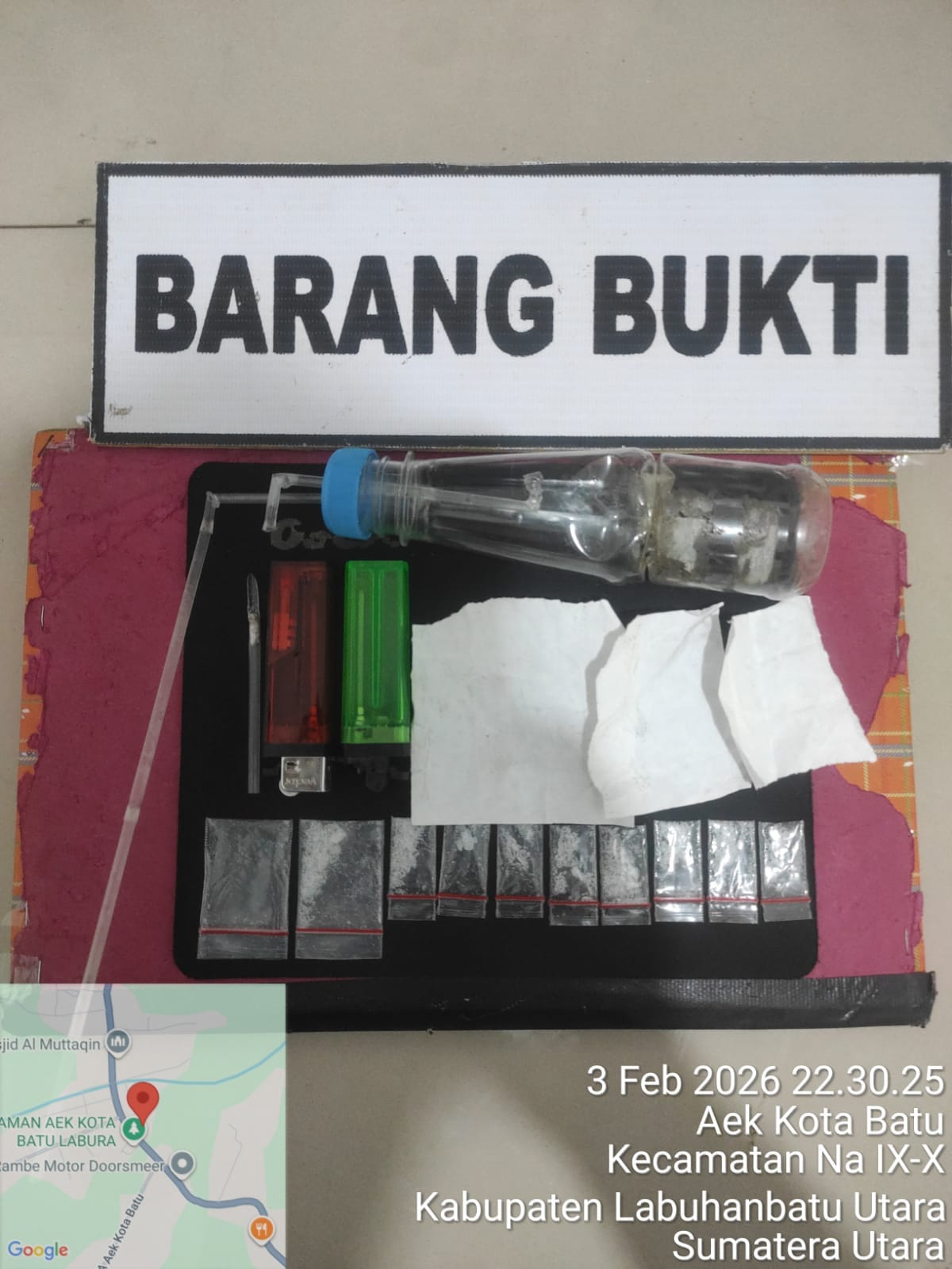 “Dari tangan tersangka, petugas mengamankan barang bukti berupa plastik klip diduga berisi sabu dengan berat bruto keseluruhan 1,78 gram, plastik klip kosong, alat hisap yang terbuat dari botol, mancis, skop dari pipet kecil, serta beberapa lembar kertas putih,” terang Kapolres Labuhanbatu, AKBP Wahyu Endrajaya, S.I.K., M.Si. melalui Plt. Kasi Humas, Iptu Arwin, S.H.,