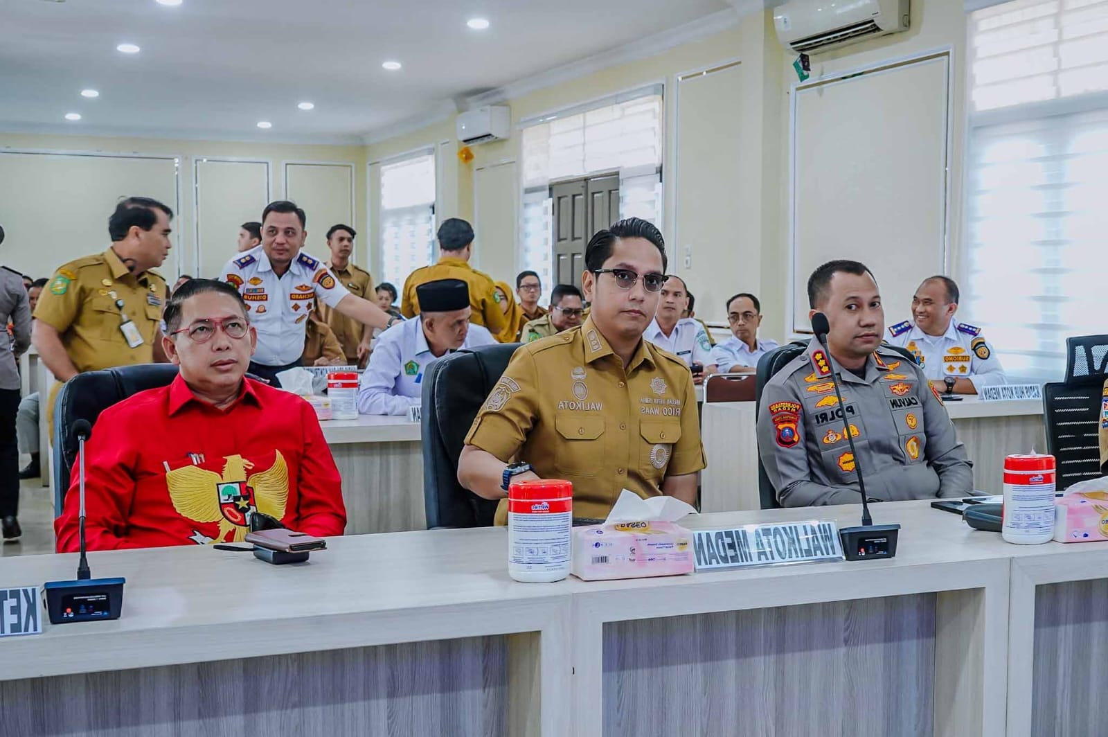Medan-Intipnews.com:Wali Kota Medan Rico Tri Putra Bayu Waas mengikuti Rapat Koordinasi (Rakor) Lintas Sektoral Pelayanan Idulfitri 1447 Hijriah secara daring dari Mapolrestabes Medan, Senin (2/3/2026).