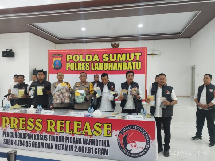 Kapolres Labuhanbatu, AKBP Wahyu Endrajaya, S.I.K., M.Si., didampingi Wakapolres, Kompol H. Matondang, S.H., M.H., Kasat Narkoba, AKP Hardiyanto, S.H., M.H., serta Plt Kasi Humas, Iptu Arwin, S.H., mengungkapkan hal itu saat konferensi pers yang digelar di Aula Yan Pieter, Mapolres Labuhanbatu, Kamis (12/02/26). (foto).