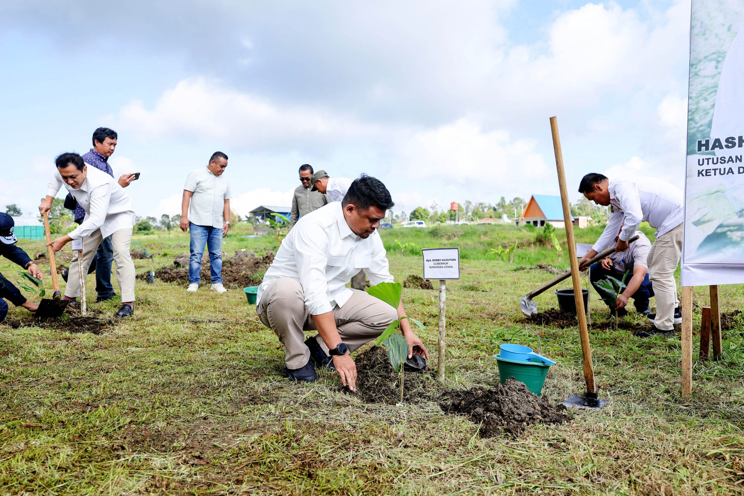 Taput-Intipnews.com:Gubernur Sumatera Utara (Sumut) Muhammad Bobby Afif Nasution turut mengikuti penanaman sejuta pohon bersama dengan Utusan Khusus Presiden Republik Indonesia Hashim Djojohadikusumo di Kompleks Perkampungan Pemuda HKBP Jetun Silangit, Tapanuli Utara (Taput), Minggu (11/1/2025).
