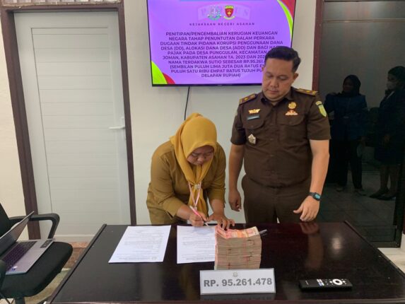 Asahan-Intipnews.com:Kepala Kejaksaan Negeri Asahan Basril G, SH MH melalui Kepala Seksi Pidana Khusus (Pidsus) Chandra Syahputra menerima penitipan pengembalian kerugian keuangan negara dari terdakwa S pada Senin (13/10/2025) di bertempat di kantor Kejaksaan