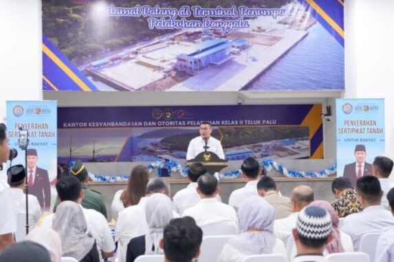 Palu-Intipnews.com:Provinsi Sulawesi Tengah mencatatkan capaian positif dalam pelaksanaan program Pendaftaran Tanah Sistematis Lengkap (PTSL) sepanjang tahun 2025. Dari total target 5.494 bidang tanah yang tersebar di 13 kabupaten/kota, telah berhasil diselesaikan sebanyak 4.797 bidang atau sekitar 95,56%. Capaian ini disampaikan Wakil Menteri Agraria dan Tata Ruang/Wakil Kepala Badan Pertanahan Nasional (Wamen ATR/Waka BPN), Ossy Dermawan, dalam momen penyerahan 160 sertipikat tanah kepada masyarakat dan pemerintah daerah (Pemda) Sulawesi Tengah, di Terminal Penumpang Pelabuhan Donggala, Rabu (09/07/2025).